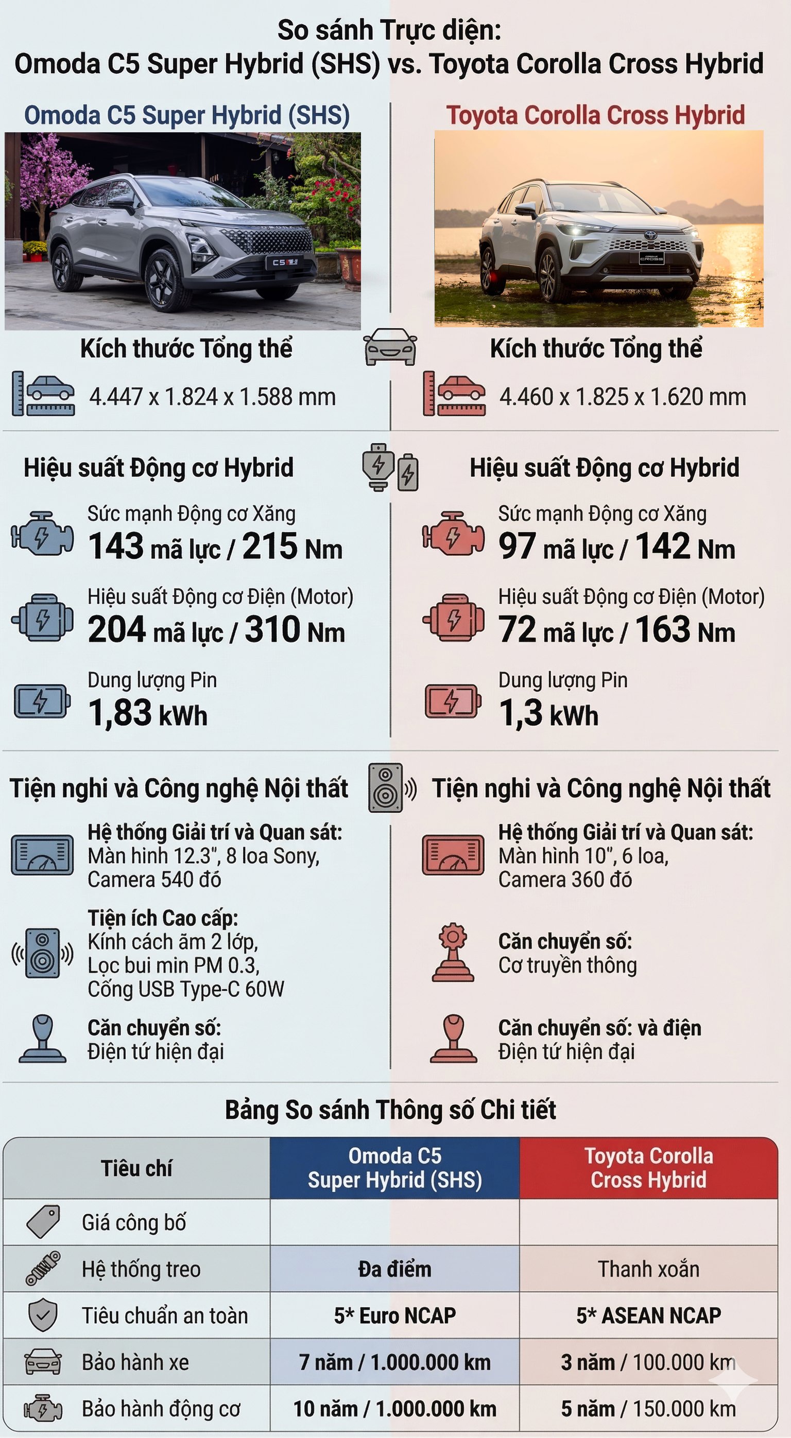Bảng So Sánh Trực Tiếp Omoda C5 Super Hybrid (SHS) Với Toyota Corolla Cross Hybrid